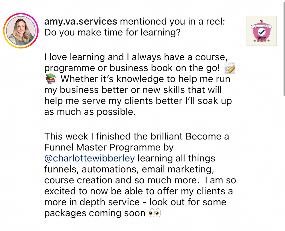 "Funnels and Automations were like a foreign language to me when I started! I immediately signed up to Charlotte's BAFM programme as I'd known her for a while and she had really inspired me.