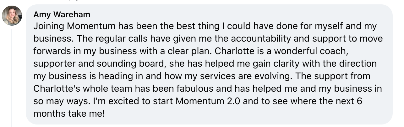 I want to join Momentum today!“I have found that this is the best money I have ever spent on me and my business. It has also clarified that I need a coach! You bring me the clarity and confidence I have needed for ….. Years!”