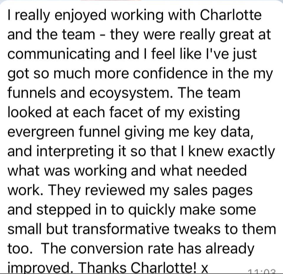 The result was a 260 percent increase in conversions from masterclass to sale. Sophie invested £2 400 in the audit and optimisation, and generated over £25 000 in new revenue from this one funnel upgrade.